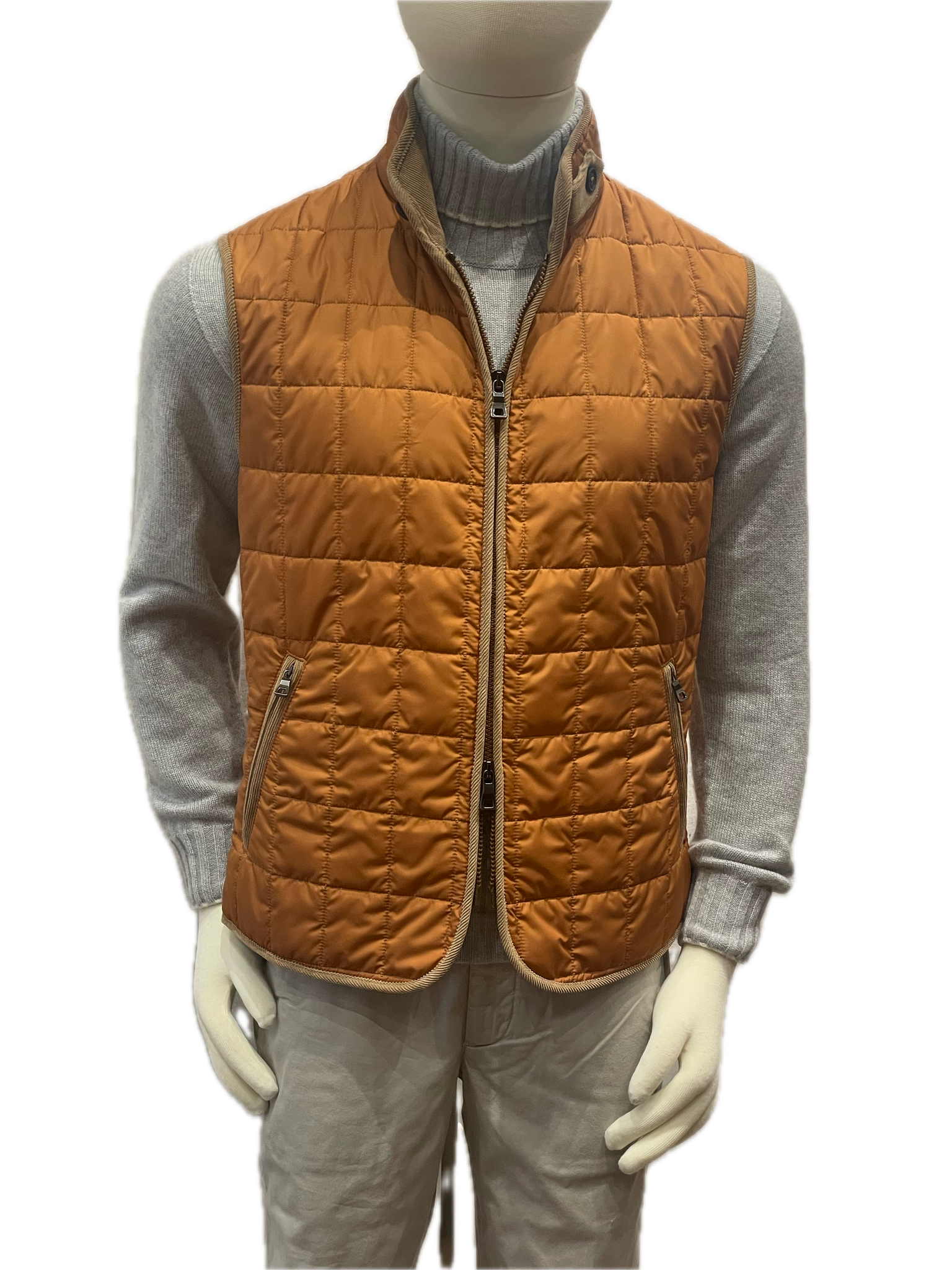 Quilted gilet in orange nylon with contrast camel stitching and camel corduroy trim