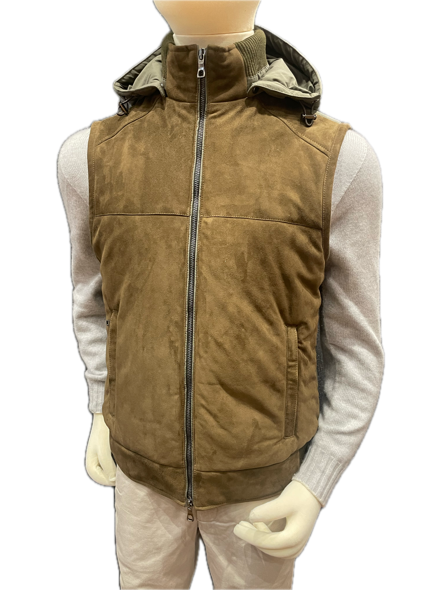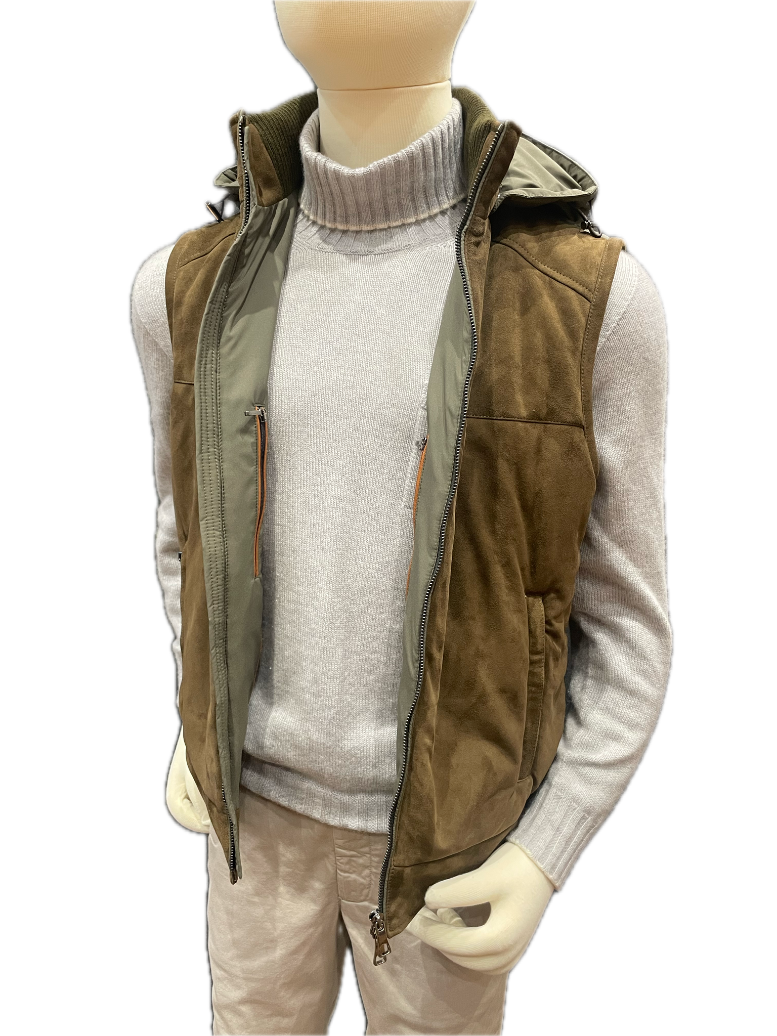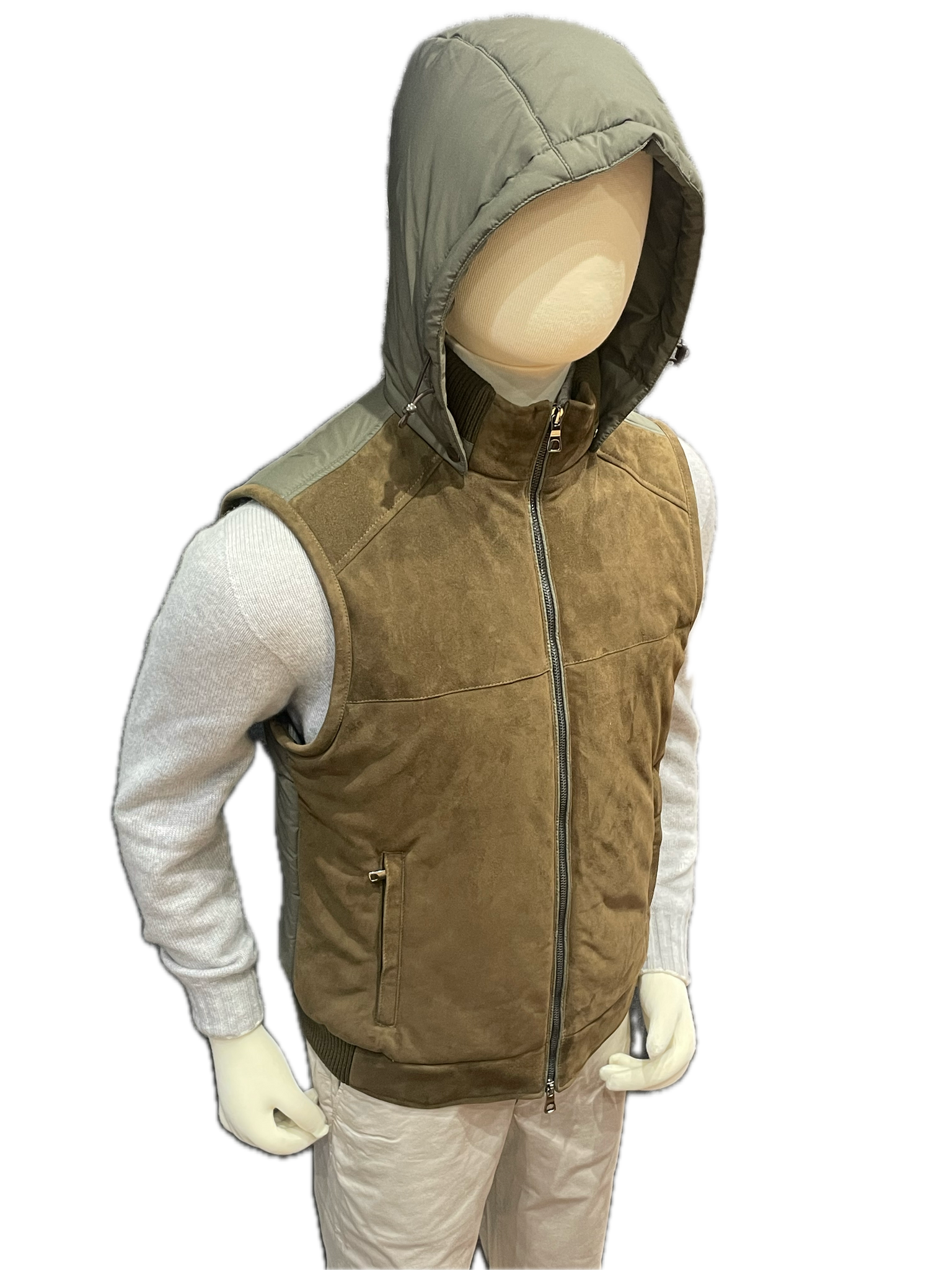 Padded Dark Olive Suede fronted gilet with Olive nylon back and removable hood.