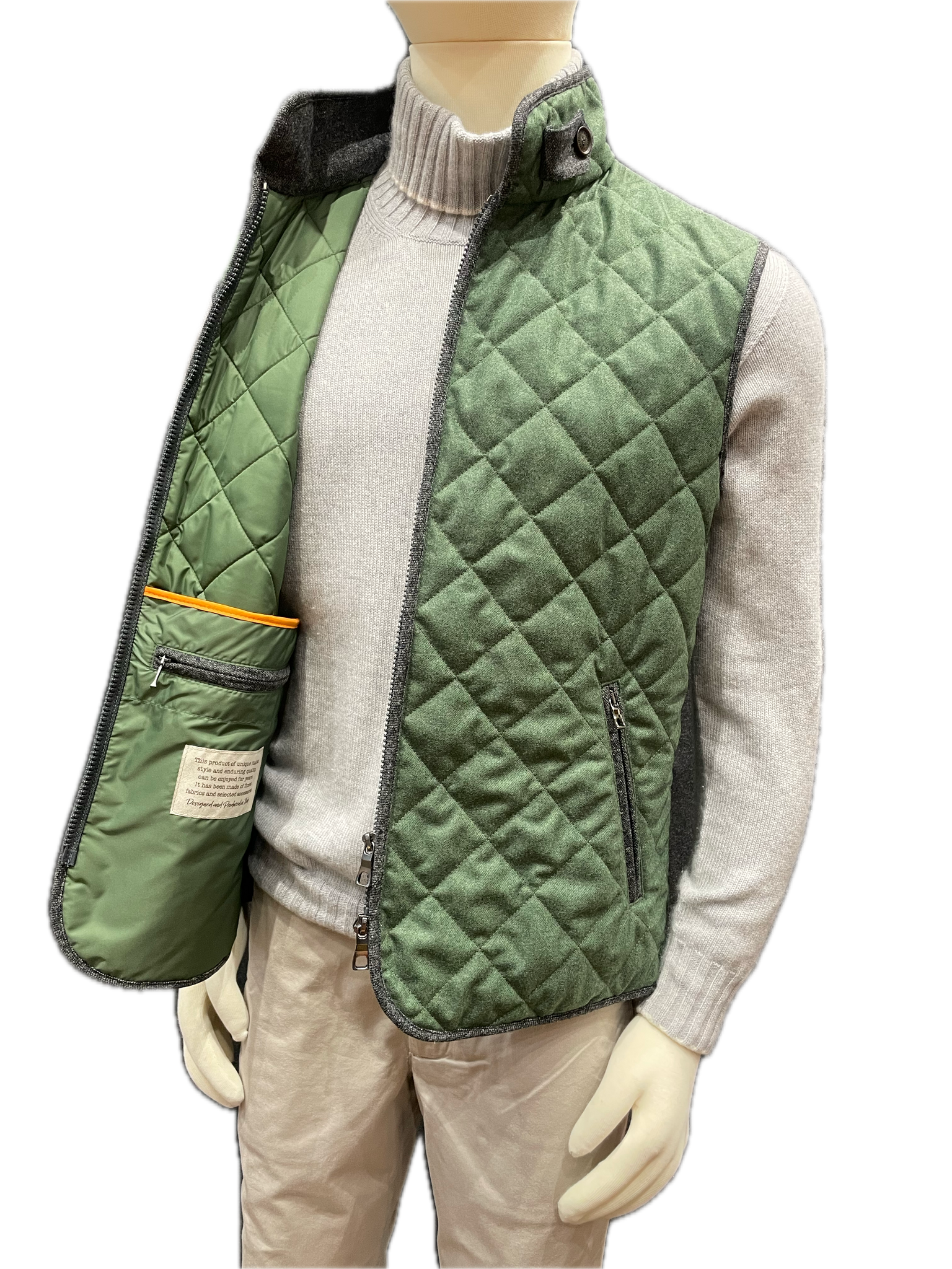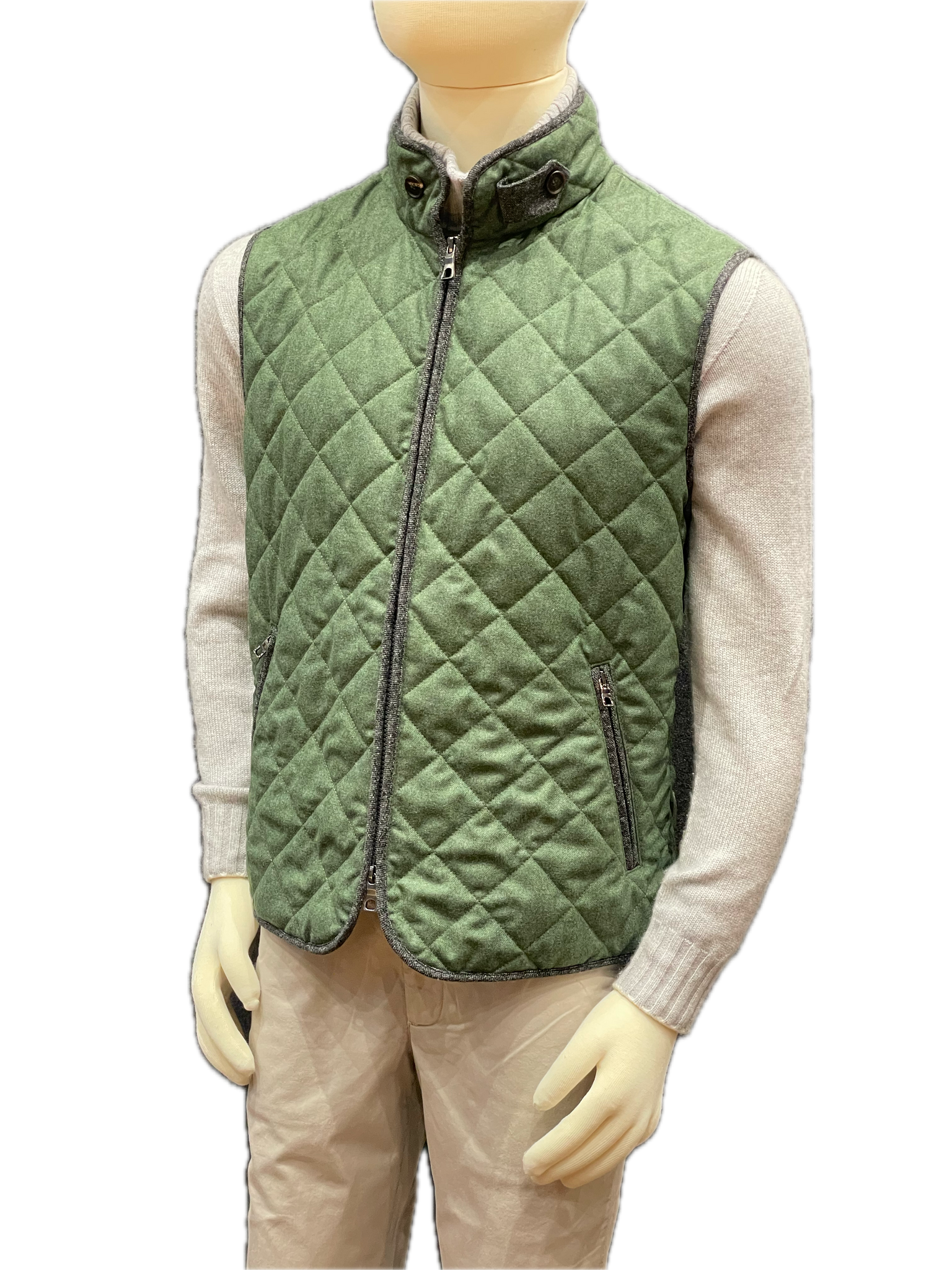 Quilted Barberis Wool gilet in Green with contrast grey trim.